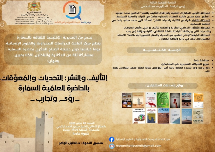 تنظم مدينة السمارة بدعم من المديرية الإقليمية للثقافة يوما دراسيا علميا حول موضوع التأليف والنشر، وذلك بمبادرة من مركز الباحث للدراسات الصحراوية والعلوم الإنسانية، وبمشاركة نخبة من الدكاترة والباحثين الأكاديميين، في إطار مواكبة الحركية الثقافية والفكرية التي تعرفها المدينة.