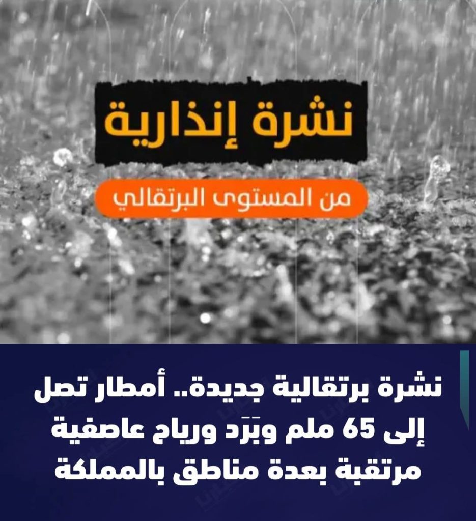 حذّرت المديرية العامة للأرصاد الجوية من اضطرابات جوية قوية يُرتقب أن تهم عدداً من مناطق المملكة، تشمل تساقطات مطرية قوية أحياناً رعدية مع احتمال تساقط البَرَد، إلى جانب رياح عاصفية محلياً قوية، وذلك وفق نشرة إنذارية من مستوى يقظة برتقالي.