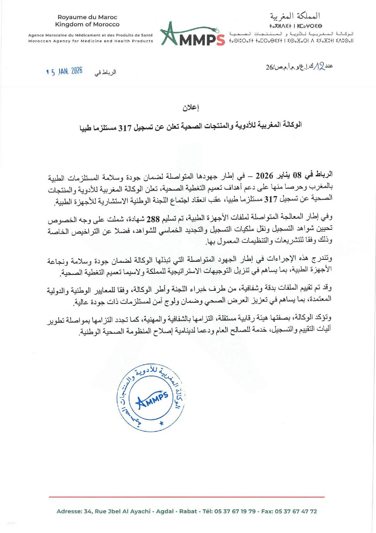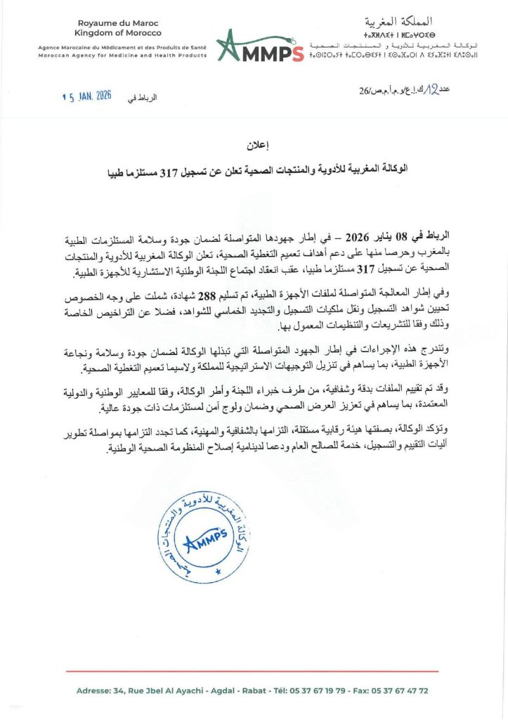 أعلنت الوكالة المغربية للأدوية والمنتجات الصحية عن تسجيل 317 مستلزمًا طبيًا، وذلك في إطار جهودها المتواصلة لضمان جودة وسلامة المستلزمات الطبية المتداولة بالمغرب، ودعم أهداف تعميم التغطية الصحية.