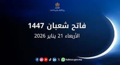 تنهـي وزارة الأوقاف والشؤون الإسلاميـة إلى علم المواطنات والمواطنين أنها راقبت هلال شهر شعبان لعام 1447هـ مساء يوم الإثنين 29 رجب 1447ه موافـق 19 يناير 2026م،