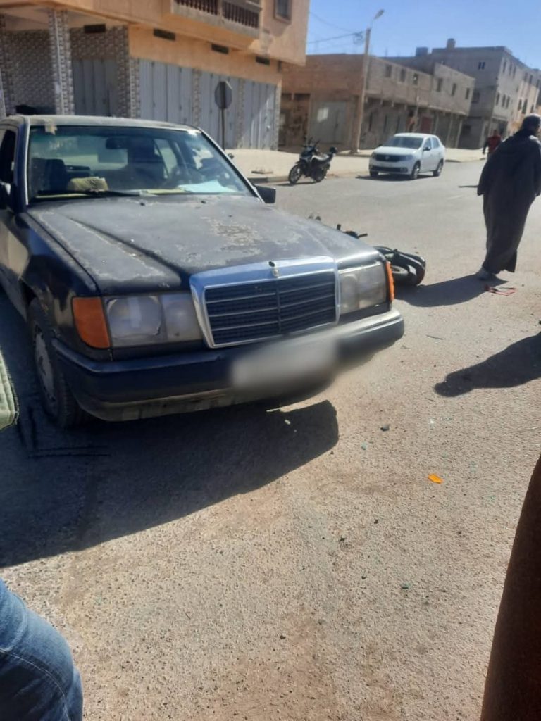 علمت العمق الصحراوي بوقوع حادثة سير داخل المدار الحضري لمدينة السمارة، إثر اصطدام قوي بين سيارة خفيفة ودراجة نارية، وذلك عند ملتقى الطرق الذي يربط بين الحي الصناعي وحي الوحدة لزاب، وهو ملتقى يشهد له بكثرة الحوادث بسبب السرعة وعدم إحترام إشارات المرور.