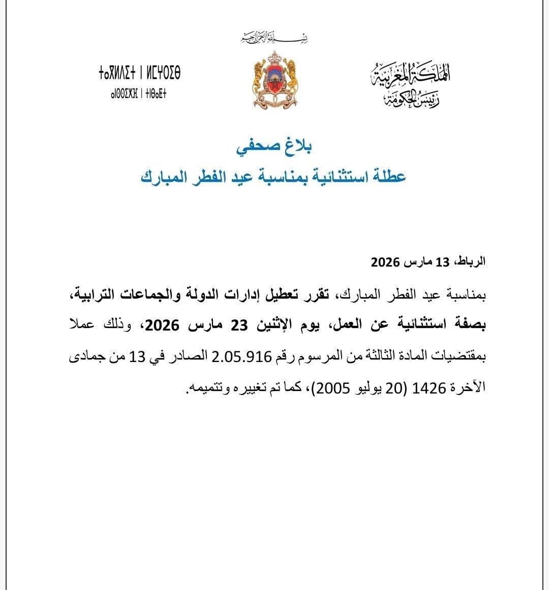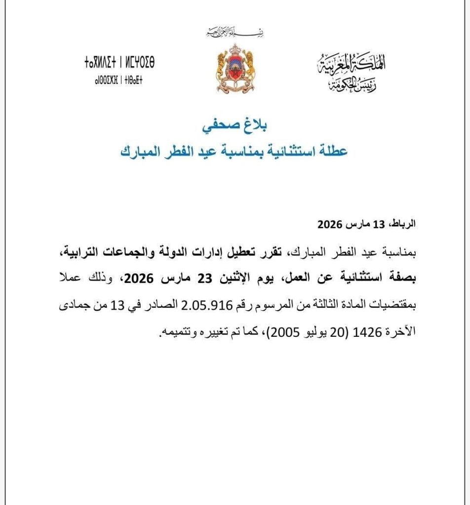 أعلن رئيس الحكومة عن تعطيل إدارات الدولة والجماعات الترابية بصفة استثنائية يوم الإثنين 23 مارس 2026، وذلك بمناسبة عيد الفطر المبارك.
