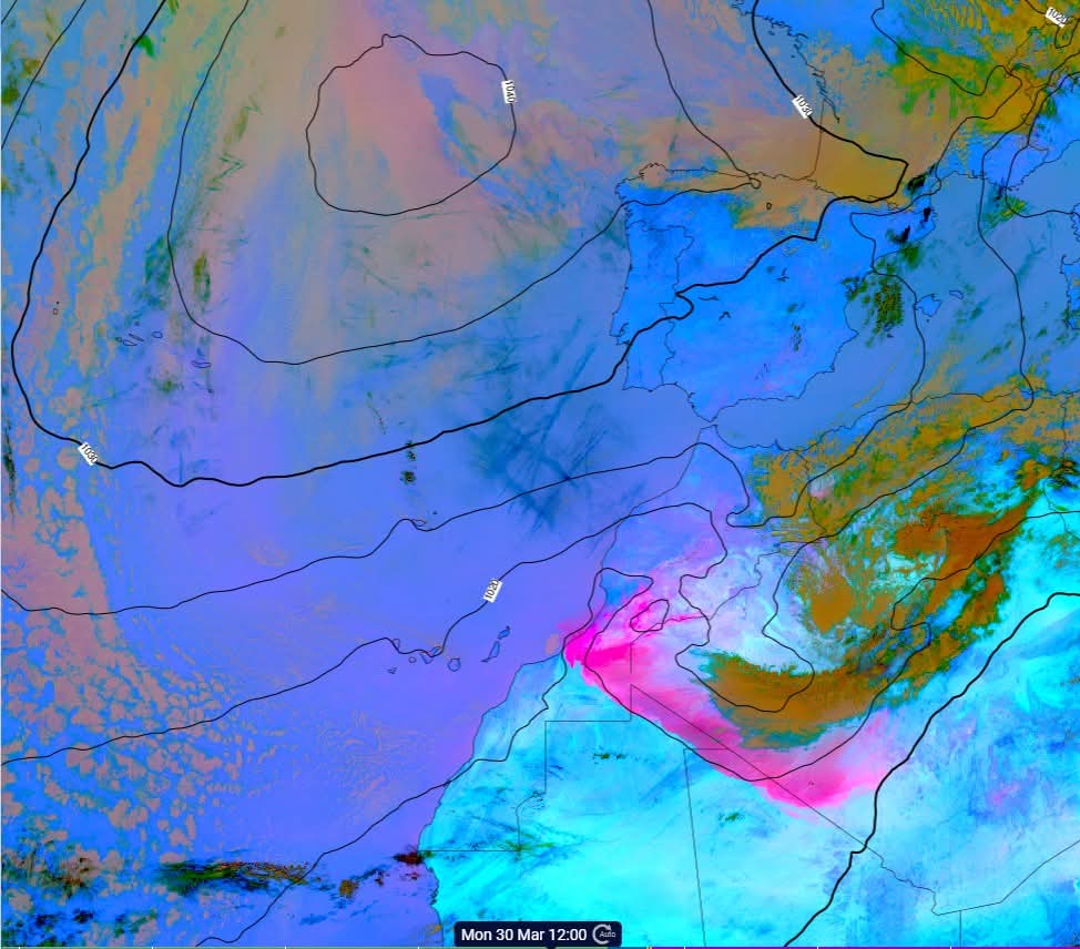 اللون الأرجواني/الوردي (Magenta): يمثل الغبار والرمال العالقة في الجو، والتي تندفع بقوة نحو المناطق الجنوبية والوسطى للمغرب، ممتدةً نحو المحيط الأطلسي.