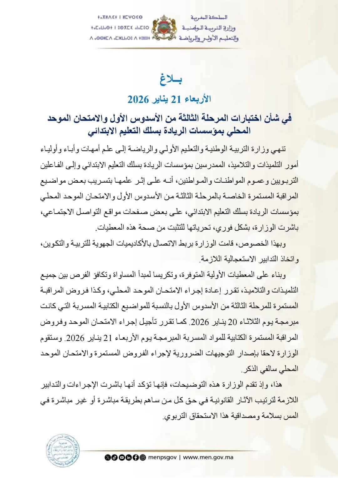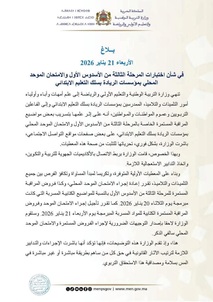 وزارة التربــــية تقــرر إعادة الامتحان الموحد المحلي والفروض للمواضيع الكتابية المسربة بسلك التعليم الابتدائي، بمدارس الريادة” وتتوعد بالمتابعة القضائية لكل من ساهم في التسريب