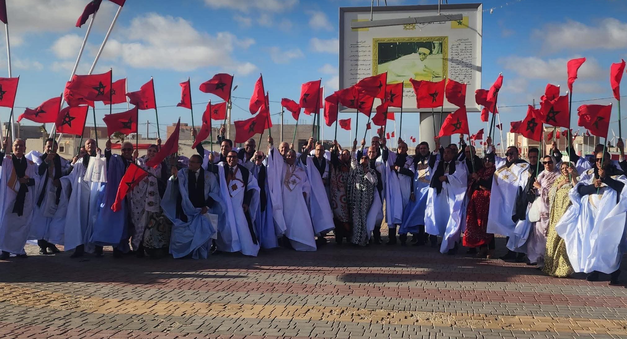 الوفد المشارك في هذه الزيارة الرمزية كان مرفوقاً بالسيد عبد السلام بيكرات، والي جهة العيون الساقية الحمراء، والسيد عامل إقليم طرفاية، إلى جانب رئيس المجلس الجماعي للطاح. وقد التُقطت صور تذكارية لأعضاء الوفد باللباس التقليدي الصحراوي، فيما رفرفت الأعلام الوطنية في مشهد مؤثر يجسد عمق الانتماء للوطن ووحدة التراب المغربي من طنجة إلى الكويرة.